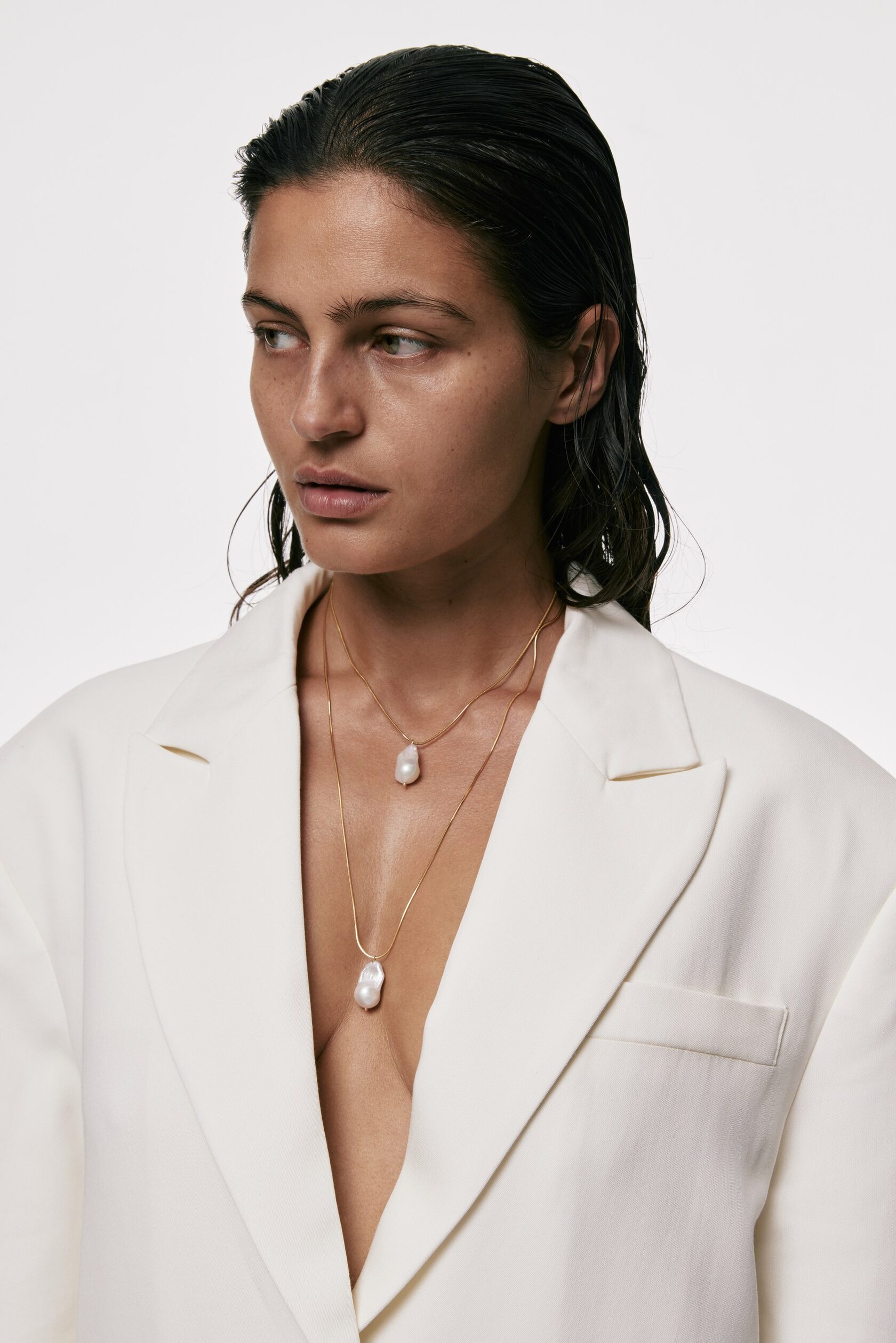 The Snake necklace merges sleekness and texture, pairing a refined gold-plated chain with a baroque pearl.