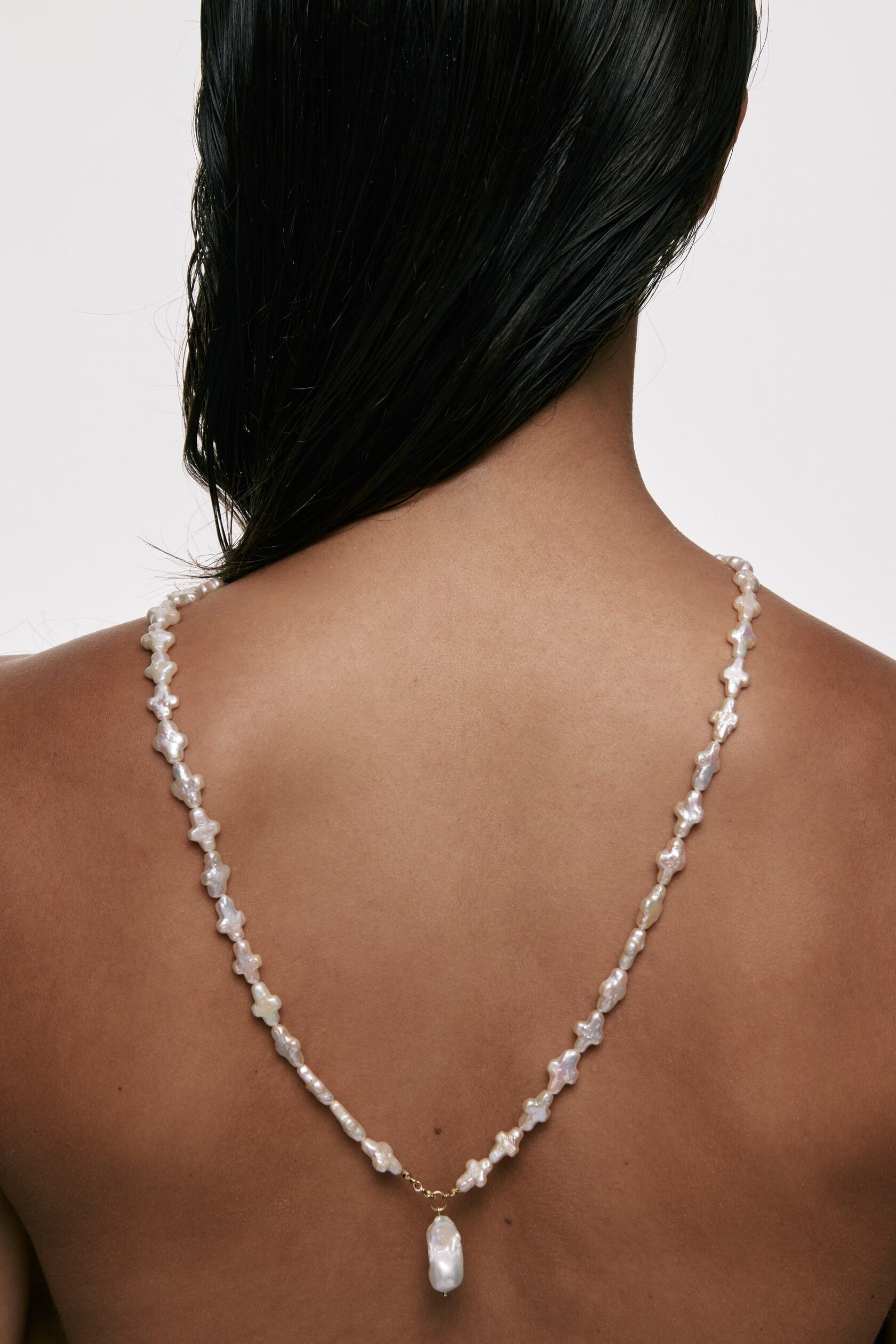 Smooth freshwater pearls with a baroque pearl pendant, each with a unique form