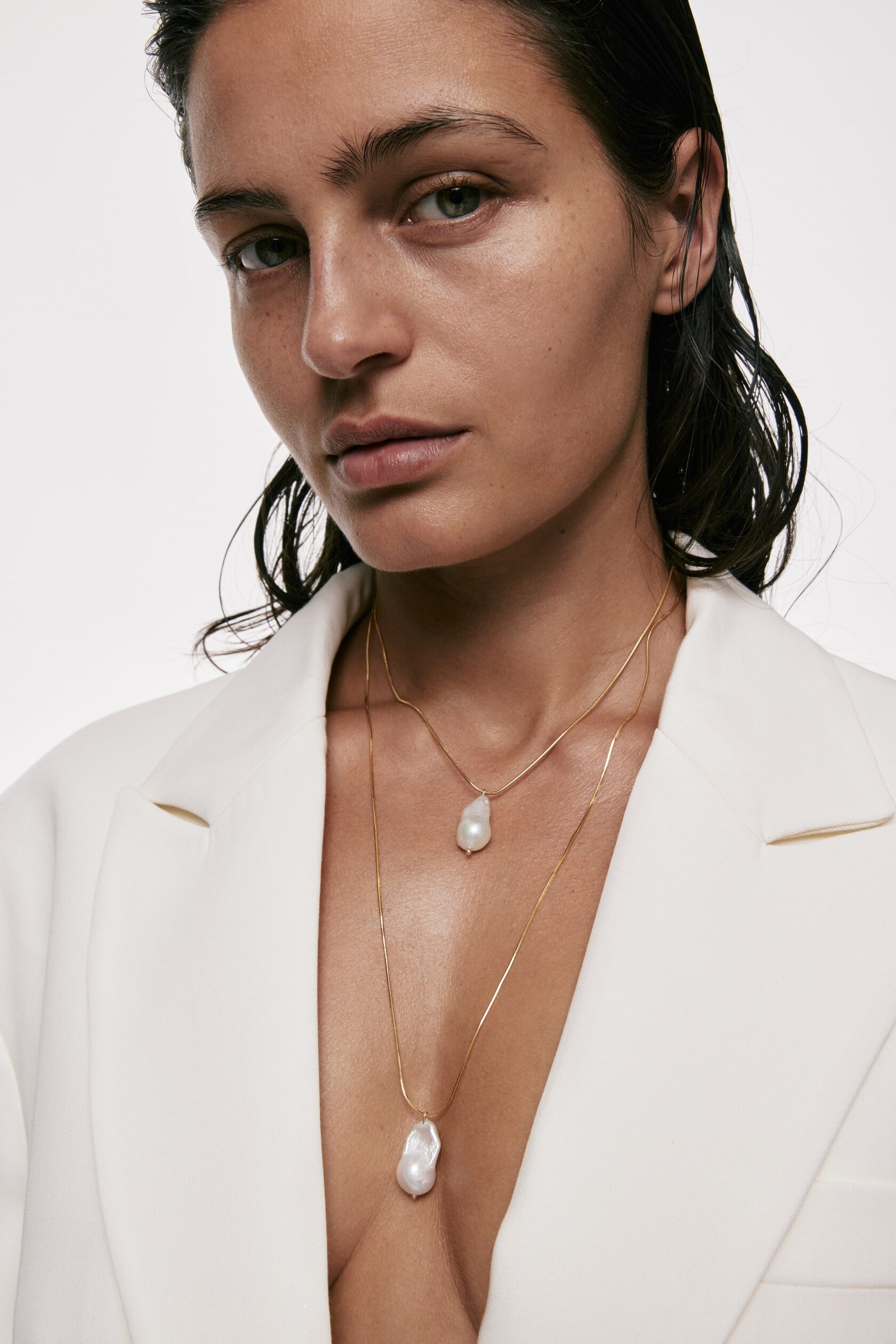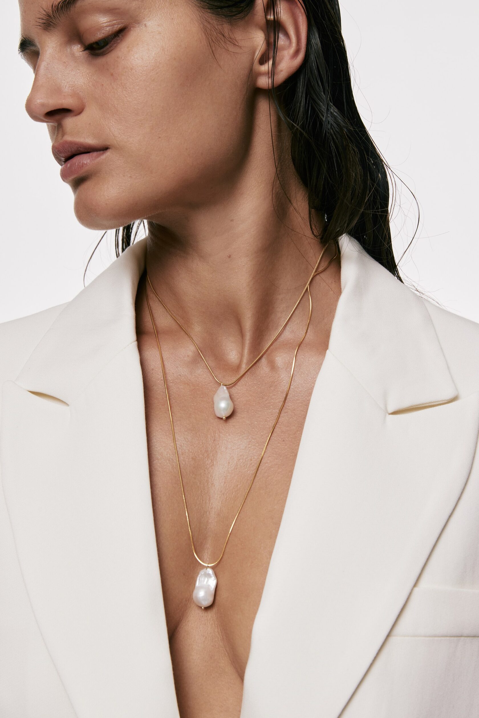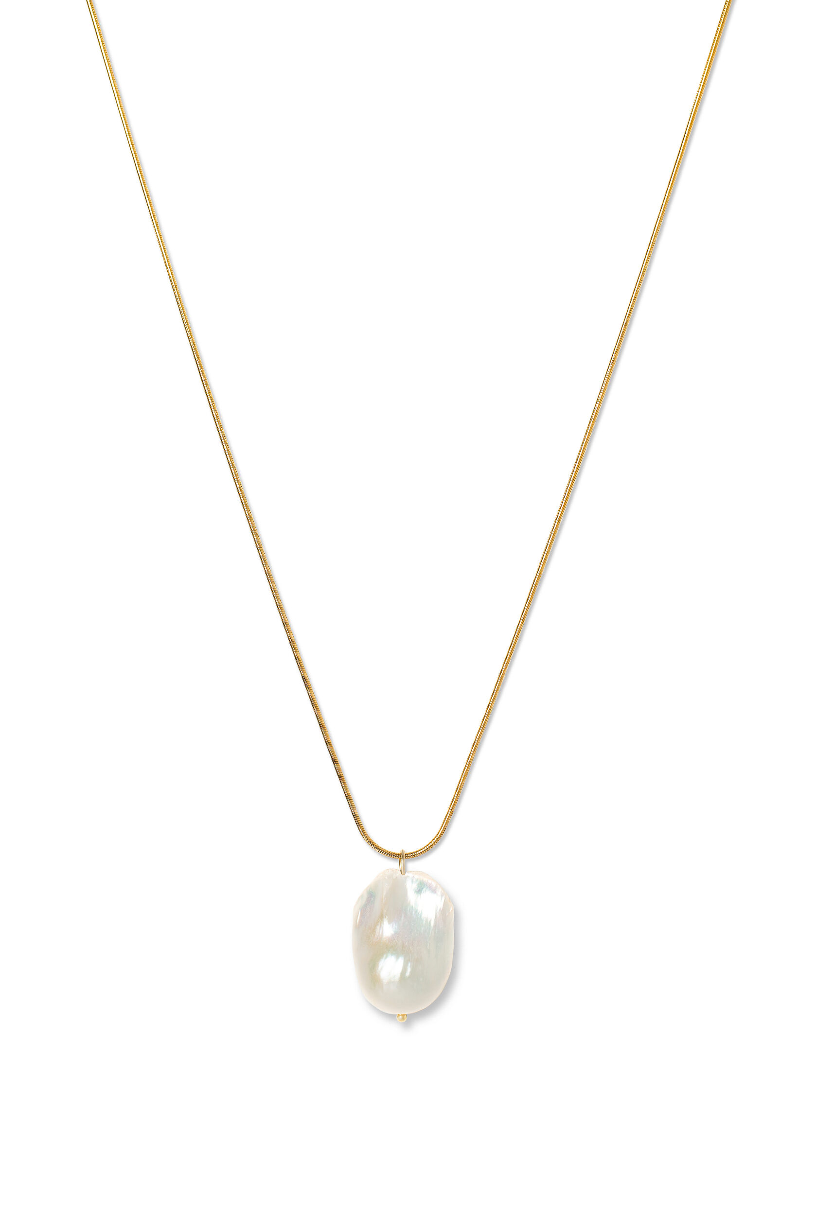 The Snake necklace merges sleekness and texture, pairing a refined gold-plated chain with a baroque pearl.